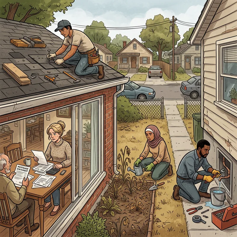 Illustration depicting a scene of homeowners from various descents dealing with the challenges of maintaining their homes. On the left, a Hispanic man repairs his roof while a Caucasian woman discusses finances at a table inside. On the right, a Middle-Eastern woman nurtures a dying garden, while a Black man is seen attempting to fix a leaking pipe. The environment is a suburban neighborhood with modest houses. The tone of the image is serious and empathetic, highlighting the difficulties in home ownership but also the resilience of the individuals.