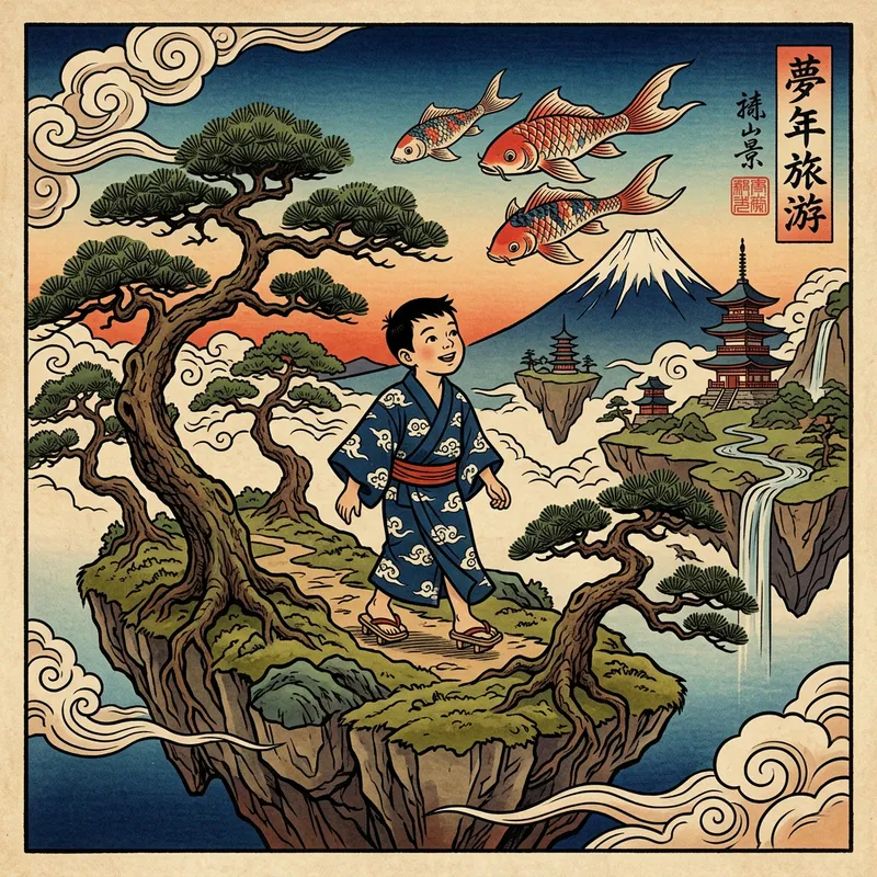 An image displaying a young boy caught in a dreamlike state, where the fantastical meets the ordinary. The style of this imaginary world represents the extraordinary, blending elements that are reminiscent of classic late 19th-century Japanese woodblock printing - emphasizing bold line work, vibrant color palettes, and intense contrast. The boy appears curious and animated in his exploration, embodied in his youthful attire, completing the scene with a sublime landscape, perhaps with flying fish, walking trees, or floating islands, abiding to the surreal quality of this ethereal journey.