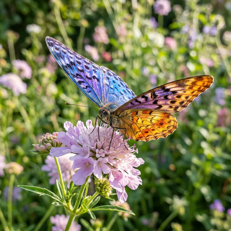 Imagine a stunning butterfly. Its wings span outwards, showcasing a dazzling array of colors. The top side of the wings display a vibrant mix of blue and purple shades while the lower side reflects a mesmerizing blend of orange and yellow hues. This exquisite creature is perched delicately on a blooming garden flower. The contrast between the vividness of the butterfly and the soft pastel tones of the flower creates a spectacle of natural beauty. Subtle sunlight filters through the scene, amplifying the iridescent glow of the butterfly's wings and making the entire scene simply breathtaking.