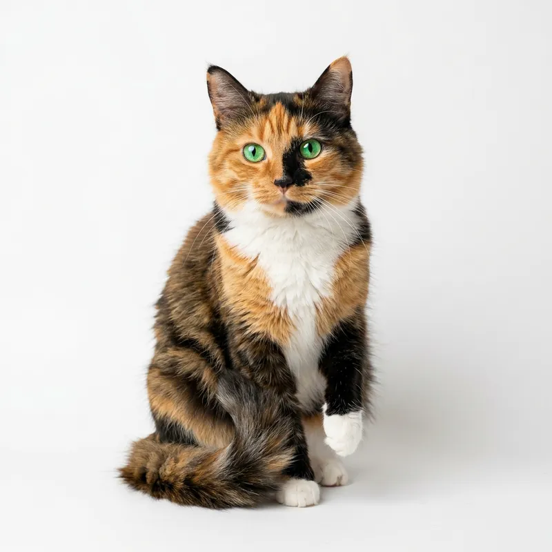 A calico cat with patches of orange, black, and white fur. The cat has green eyes that glow with curiosity. It is sitting elegantly, one paw lifted slightly off the ground. Its fluffy tail wraps around its body, and its ears are pitched forward, clearly engaged and alert. The backdrop is a simple white, focusing all attention on the colorful feline.