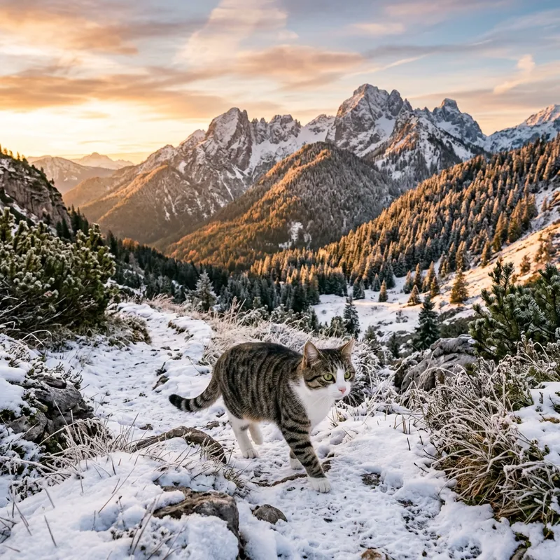A vibrant image of a beautiful adult feline leisurely making its way through a breathtaking landscape. This cat is of short hair variety, with soft stripes adorning its fur - a perfect blend of whites, blacks, and grays. The cat's eyes are a capricious shade of green, sparkling with a mix of curiosity and delight. It is walking in a picturesque mountain range, a medley of rugged peaks sharply rising against the horizon. The mountains are covered with a lush blanket of pine, spruce, and fir trees, which are in turn lightly dusted with fresh white snow. The sun hangs low in the sky, casting long shadows and bathing the scene in a warm, golden glow.