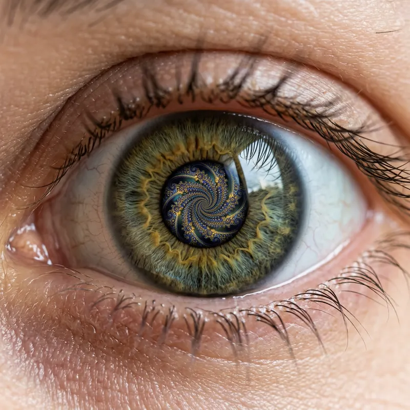 Generate a realistic image depicting a stunning fractal pattern wonderfully woven into the pupil of a human eye. The intricate design exhibits the beauty of infinity, representing the perfect mix of chaos and order. The fractal forms a spiraling vortex of complex geometrical patterns, adding an unusual twist to the conventional depiction of a human eye. The entire setting is under natural light, enhancing the details and adding to the optical brilliance.