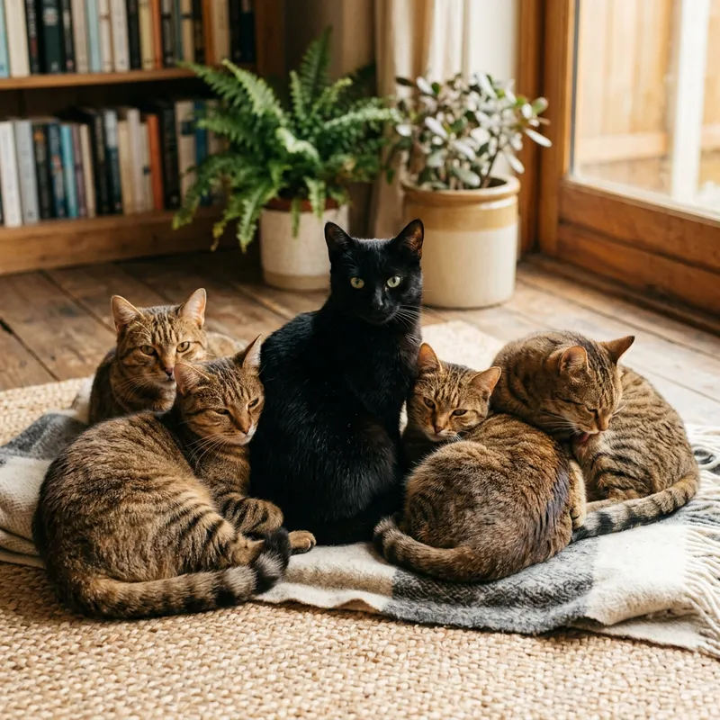 Group of Five Felines with Striking Black Fur and Delicate Brown Stripes
