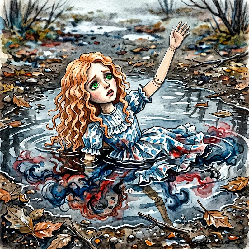 An illustration of a stunning paper doll; she possesses vivid green eyes and her hair cascades in light red curls. The doll seems to have taken off, now fatefully sinking in a puddle of water. Her hand is extended outward, possibly in a final bid for salvation. The ink from the paper doll begins to disperse into the surrounding water in a captivating spectacle, embodying a profound sense of despair.