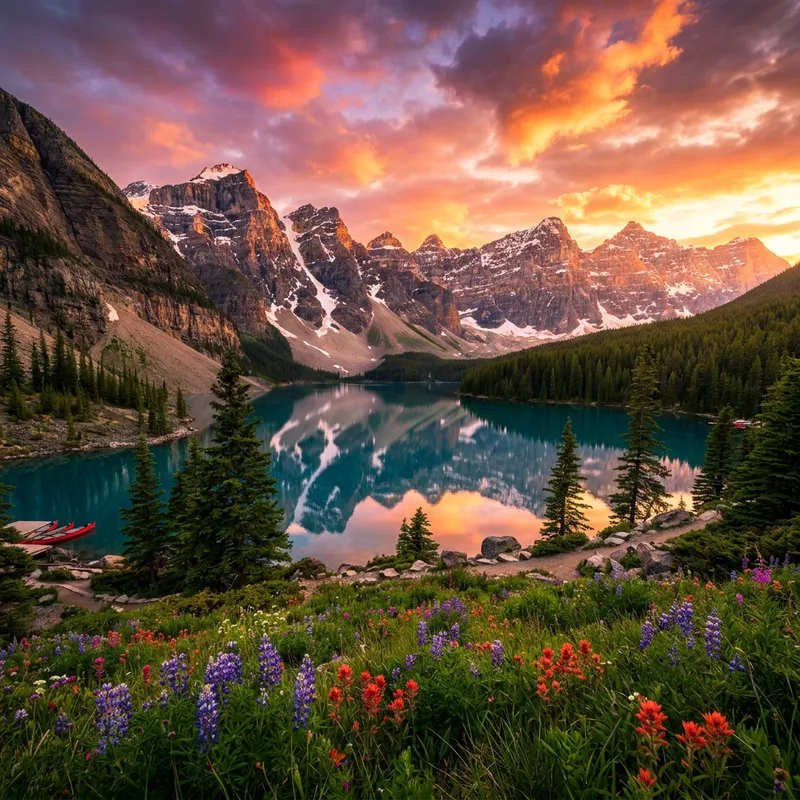 A landscape scene displaying stunning, vibrant colors. Picture a setting where the foreground is rich in lush greenery, perhaps an expansive meadow or a thick forest. In the background, majestic mountains rise, maybe-snow capped or rocky, with the sun either rising or setting over them, casting an array of colors across the sky. A nearby lake reflects all these colors, adding an element of tranquility to the scene.