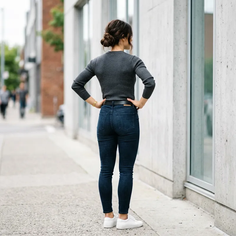 A portrait of a contemporary woman viewed from behind, highlighting her well-toned physique. She is wearing stylish casual clothes which accentuate her fit figure. She has a confident posture, standing tall with her hands on her hips. Her hair is styled in a chic updo, and she is set against a neutral background.