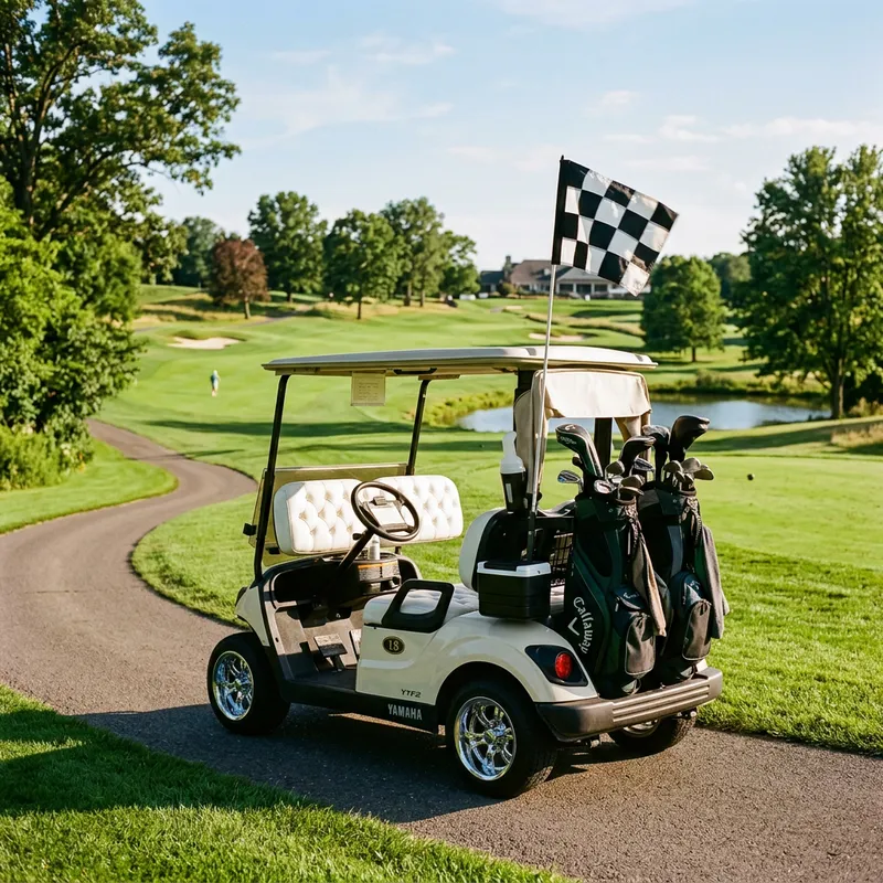A golf cart is positioned in the middle of a beautiful golf course, surrounded by manicured lawns and vibrant green trees. A checkered flag is standing erect on the back of the cart, fluttering in the gentle breeze. The front of the cart is punctuated by a pair of chic white leather seats, and the golf club bag rests on the rear. The wheel rims glisten under the warmth of the afternoon sun, reflecting the scenic surroundings. The overall essence of the image animates a relaxed, leisurely mood.