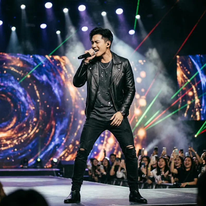 A stylish male singer with a black hair and sharp features, wearing fashionable clothes, performing on a grand stage under vibrant lights. He has a microphone in hand and is singing passionately.