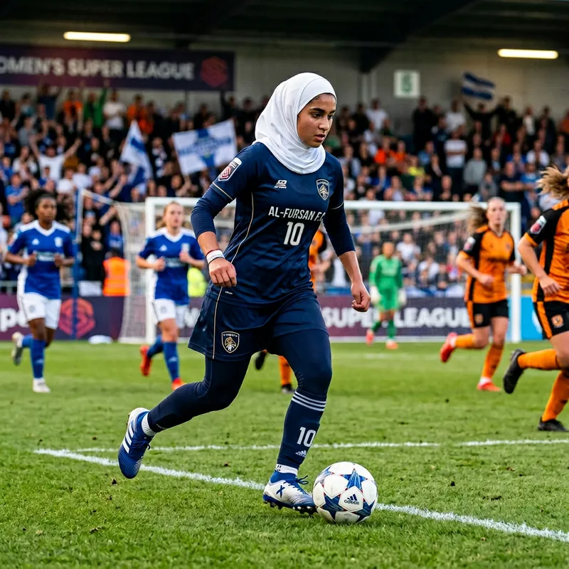 A Muslim girl of South Asian descent is seen engaged in a game of football. She is stylishly clad in a dark blue dress which compromises neither her agility nor her modesty. Her head is gracefully covered with a white scarf. The motion of play can be seen in her consistent focus and unwavering control over the ball. The atmosphere around her is vibrant and competitive, matching her spirit.