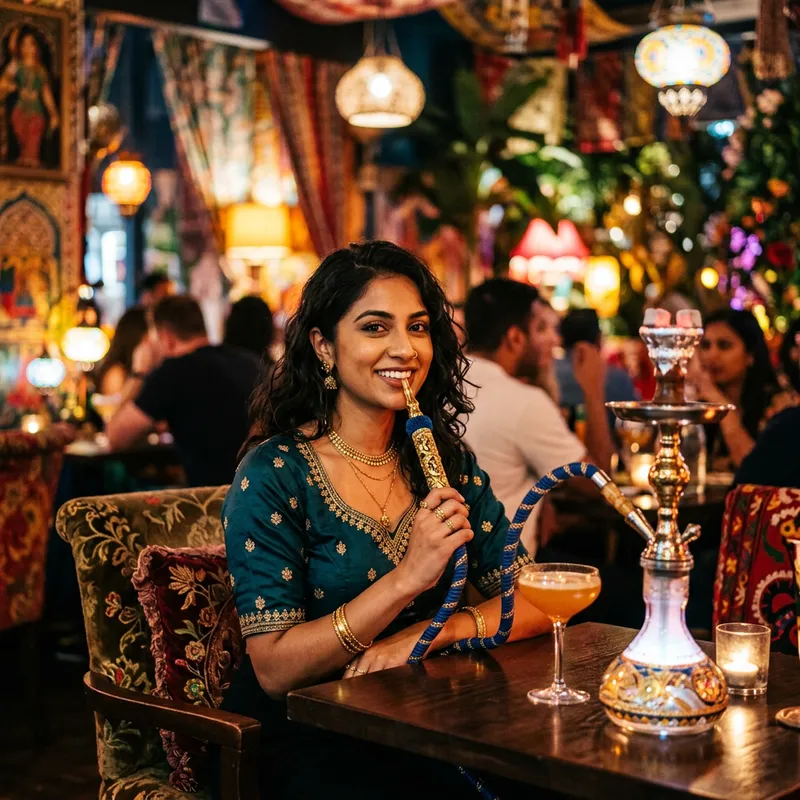 A confident and relaxed, young South Asian woman enjoying a stylishly decorated shisha pipe. She is seated in a vibrant and colorful restaurant representing a modern cultural fusion. The scene should capture the mood of a high-fashion photoshoot with dramatic lighting and bold colors. Include the visual effects akin to a 50mm lens imaging with a bokeh effect, typically achieved with a professional camera, such as Sony A7III.