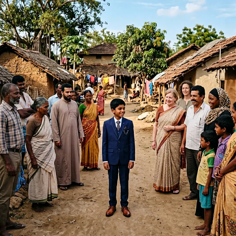 A South Asian boy clad in a stylish suit finds himself in the middle of his village. His suit, decidedly out of place amidst the rustic charm of the village, glistens under the afternoon sun. The villagers, a mixed group of Caucasian, Hispanic, Middle-Eastern, Black, and South Asian men and women, stand around him, their expressions a mix of curiosity and amusement. Traditional cottages with thatched roofs spread out in the background, juxtaposing the rural life against the boy’s modern attire. The scene embodies a stark yet fascinating clash of simplicity and sophistication.