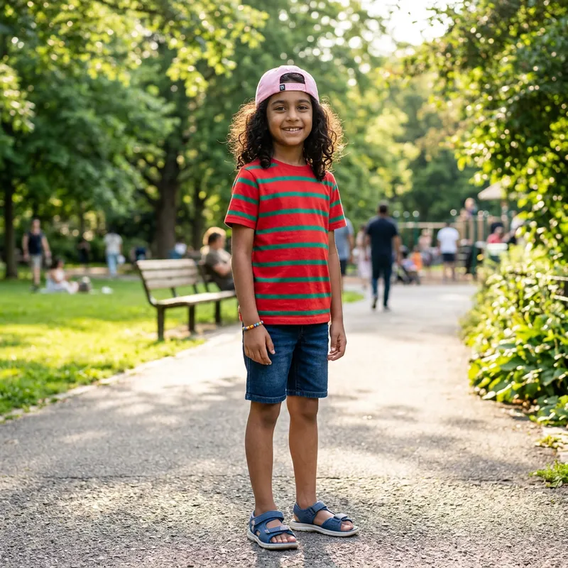 A South Asian boy with long, curly hair. He is wearing a vibrant red shirt adorned with emerald green stripes. Tuned into the latest fashion, atop his head sits a trendy pink cap. On his feet, he sports a pair of casual, blue sandals against the backdrop of a sunny afternoon in a park.