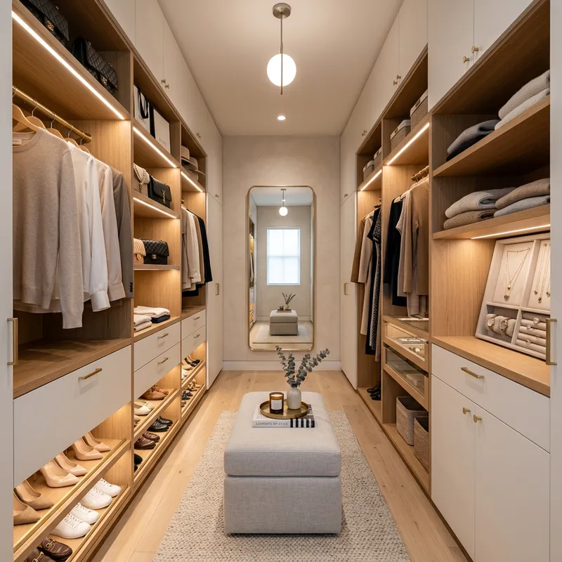 stylish walk-in closet interior, featuring elegant shelving and soft lighting, in the style of modern minimalist design with neutral tones, showcasing organized spaces and luxurious touches, wide-angle lens photography, interior design showcase