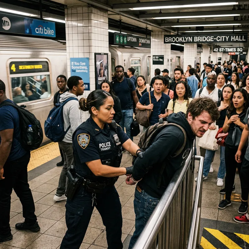 An intense scene set in a bustling subway station. In the center, a Hispanic female transit police officer with a stern expression is apprehending a Caucasian male suspect who is assumed to be a thief. The officer is responsibly handling the situation, clearly trained and brave. People of various descents are watching the event unfold from a safe distance - you can see a hint of surprise and awe on their faces. The environment is accurately depicted as a typical subway station with clear signage, billboards, and trains passing in the background.
