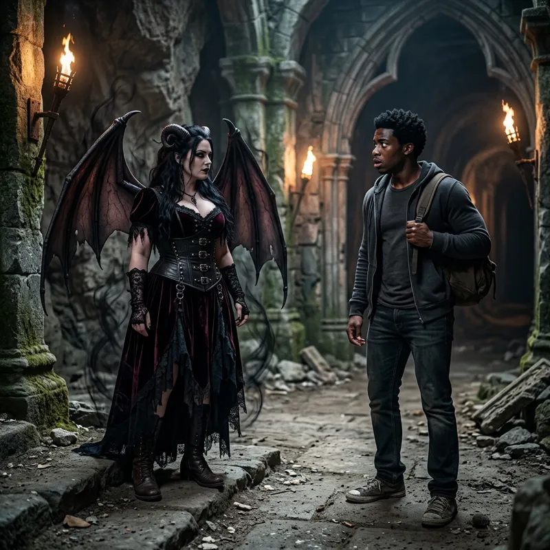 A scene that portrays a fictional female creature with large bat-like wings, curvaceous figure adorned in a provocative Gothic attire, emanating a dark, ominous aura - a classic depiction of a succubus from folklore. Alongside her, a young man of African descent with a muscular build, short curly hair, and dressed in casual modern-day attire, exhibiting a mix of fear and fascination. Their setting: a dimly-lit, cavernous underworld echoing the eerie sensation of an old, haunted castle.