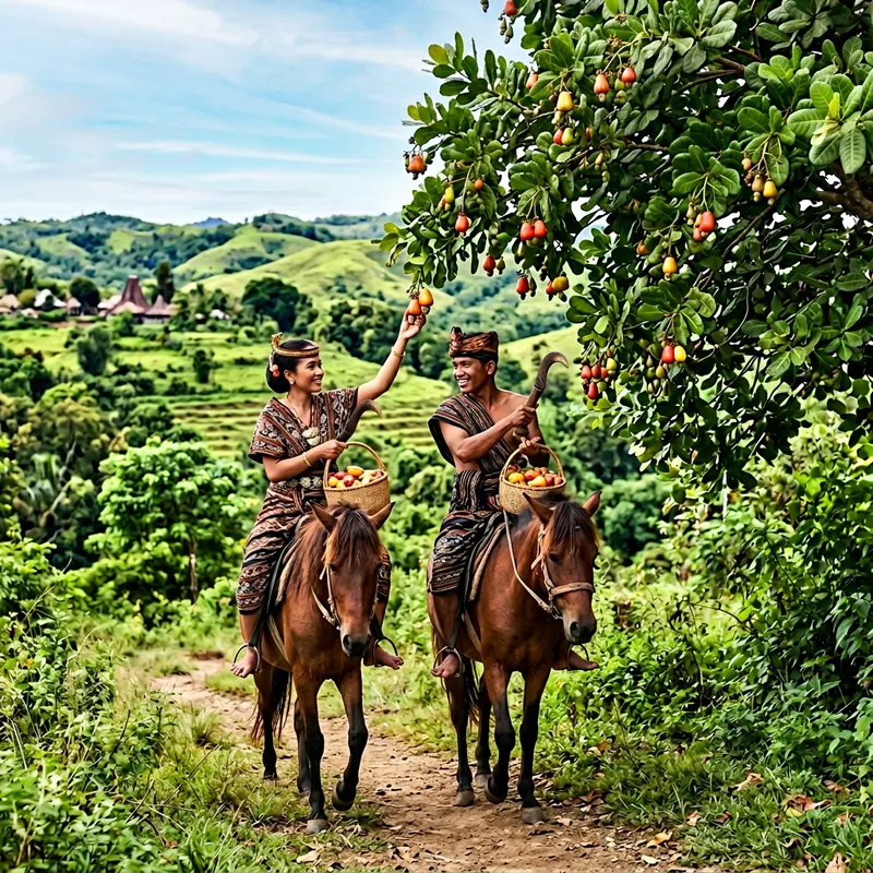 A female and male pair identified as a couple from the Indonesian island of Sumba wearing traditional Sumbanese attire. They are seen horseback riding, giving off images of harmony and cooperation. In their hands, they have tools used for picking cashew nuts. A lush jambu tree is nearby, it's branches full of ripe cashew nuts ready to be harvested. The backdrop of the image is a bright blue sky and fresh green foliage, further emphasizing the natural and rustic lifestyle of this couple.