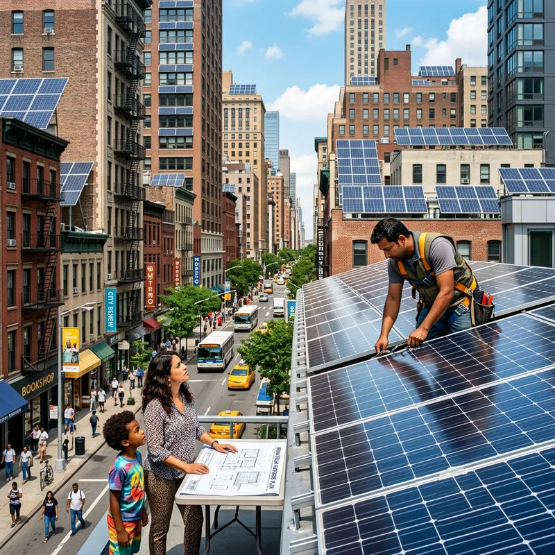 Imagine a bright, sunny urban environment teeming with life. The tall buildings, made of brick and steel, stretch towards the blue sky. Nestled among these buildings, you find an unexpected innovation. Mounted on rooftops, fire escapes, and balconies, you see solar panels. They are sleek and slim with a reflective surface that gleams under the sun, capturing and converting its radiant energy into electricity. People from diverse descents are walking on the sidewalks. A South Asian man is adjusting a panel on a rooftop while a Hispanic woman looks over blueprints of a solar plan on the ground. A black child is curiously watching the adults at work.
