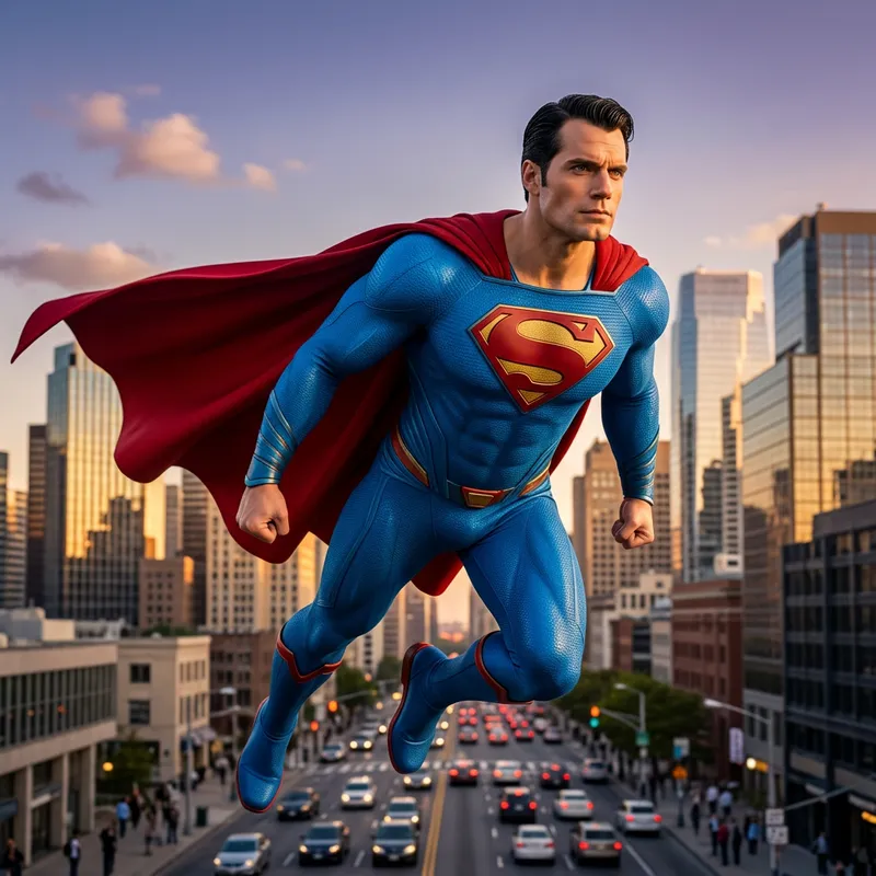 A fictional superhero character in a bright blue costume with a red cape. He has slick, dark hair and is known for his incredible strength, speed, and ability to fly. His chest is emblazoned with a unique symbol, a large 'S' in a diamond shield. He also exhibits high moral character and is dedicated to protecting the world. He hails from a distant planet but calls Earth his home.