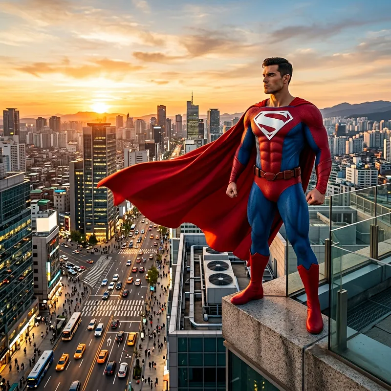 Create a magnificent view of a superhero. He is muscular but not bulky, with a perfectly chiseled jawline and a bold, sharp gaze. He's wearing a vibrant red and blue suit with a large white symbol on his chest. His majestic cape, also red, flows freely behind him as he oversees the city from a towering skyscraper. The sun is beginning to set, casting a golden glow over the city and highlighting the hero's figure. In the background, cars and buses move along the city streets, and pedestrians hustle and bustle, all oblivious to the guardian watching over them.