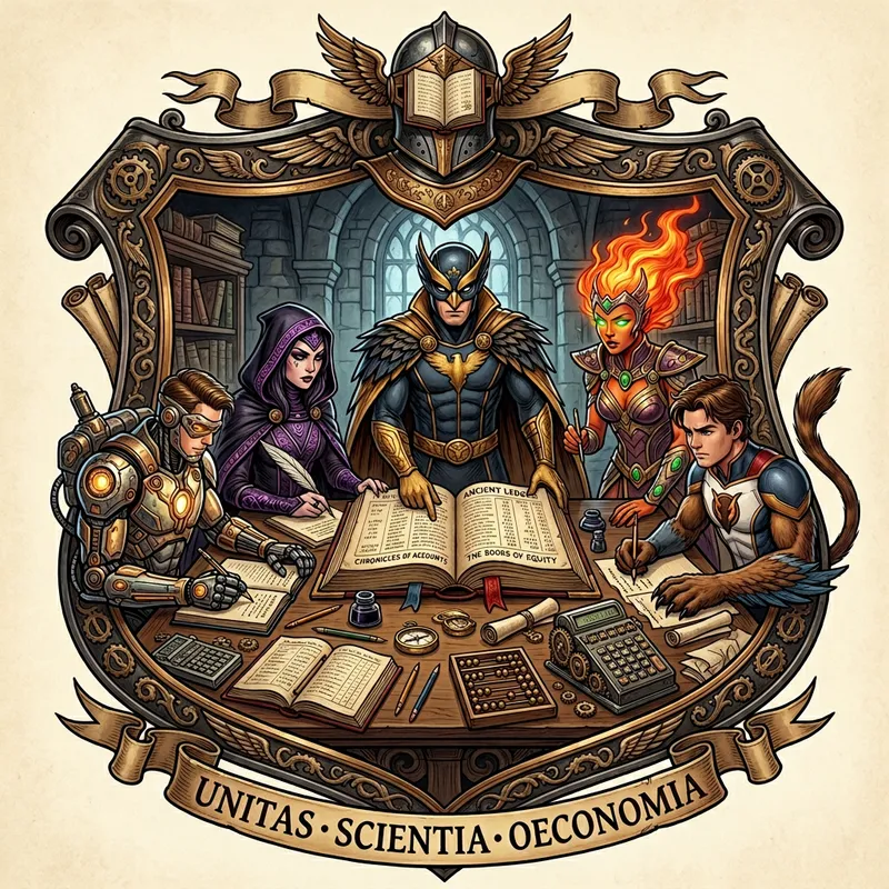 Superheroic Figures Studying Accounting Crest Design