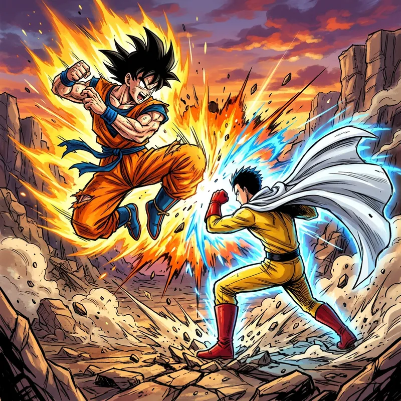 A high-stakes conflict scene between two superhuman martial artists, one in an orange martial outfit with spiky hair, the other in a simple yellow jumpsuit and a white cape. The scene is reminiscent of traditional manga, displaying vibrant colors and bold outlines. Both characters strike exaggerated action poses, their bodies frozen in the midst of the battle. The medium feels like a digital painting, seamlessly integrating cel-shading and soft brush effects, as typically seen in animated Japanese shows. The scene is bursting with explosive energy effects, underscoring the incredible power of the duel.