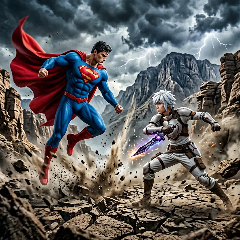 A scene depicting a clash of titanic proportions between two extraordinary individuals: one is portrayed as a muscular man, standing proud in a bright blue costume with a red cape flowing in the wind, his chest adorned with an iconic symbol resembling the letter 'S'; the other is depicted as a youthful adventurer in white attire with lightweight armor, carrying a uniquely crafted knife. They are poised in combat stances, the intensity of their confrontation reverberating in the air around them.