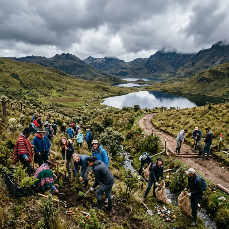 An image depicting a diverse group of people working together to support the Andean moorlands in the Azuay province. They are seen planting native flora, cleaning up the environment, and maintaining trails. The beauty of the Andes, with its lush landscape and rolling hills, serve as the backdrop to this picture of environmental stewardship. The moorlands are dotted with beautiful lakes reflecting the clear, blue sky. The weather is cloudy, suggesting it might rain any moment, which is typical for this high-altitude ecosystem.