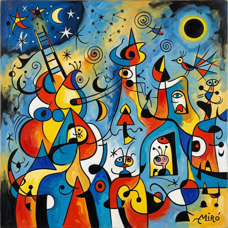 Abstract representation of architecture incorporating the playfulness, bright colors, and organic shapes typically found in pre-1912 era paintings, intend art to be reminiscent of Joan Miró's style. The design should incorporate elements of surrealism, added to the scene should be curved lines, geometric shapes, stars, and the color palette should feature primary colors such as blue, red, and yellow, as well as black and white.