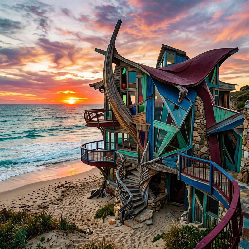 A beach house employing abstract design elements. Surreal versions of its conventional features elongate and distort. The main building structure is asymmetrical, displaying a mixture of geometric shapes, unusual angles, and unexpected parabolic curves. The material seems like a blend of wood, glass, and stone, painted in an unconventional combination of colors-note hues of blue, green, and deep red. The backdrop features a sandy beach with light foamy waves lapping over the shore, and the horizon is dotted with a bright sun setting, splashing the sky with shades of orange, pink, and purple. This distinctive image relies on the principles of the abstract art movement.