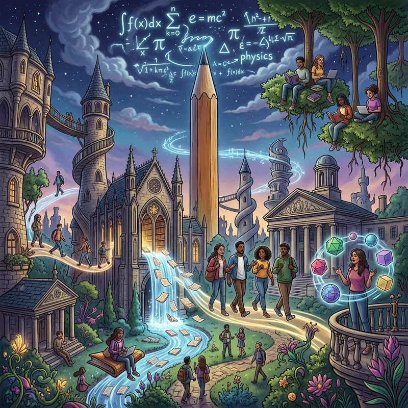 A surrealistic interpretation of campus life. Think of traditional academic buildings with their classic architecture, but twisted with unexpected elements: perhaps rivers flowing from library books, clouds drifting inside classrooms, or trees growing upside-down from the sky. The scene is bustling with students of different genders and descents, all walking in mid-air, studying while hanging from trees, or having conversations with floating 3D geometric shapes. In the center, a colossal pencil towers above the scene, scribbling equations on the sky, symbolizing academic pursuit. All these elements coexist in a magical harmony that defies the laws of nature yet feels deeply familiar.