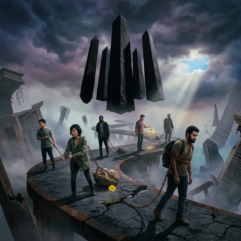 Imagine a unique scene representing a group of expats, each battling with their own dark clouds of depression. This notion should be portrayed not directly, but through surreal and abstract elements. Show their struggle by enigmatic metaphors - perhaps heavy chains they are forced to hold, or dark menacing obelisks looming above them. Translate their feelings into an assortment of gloomy and oppressive colors, yet catch fleeting fragments of hope in the form of unexpected bright spots. The ethereal environment should echo their emotional turmoil, maybe swirling paths and unstable constructs. Don't forget to express diversity by depicting the expats as people of different genders and descents.