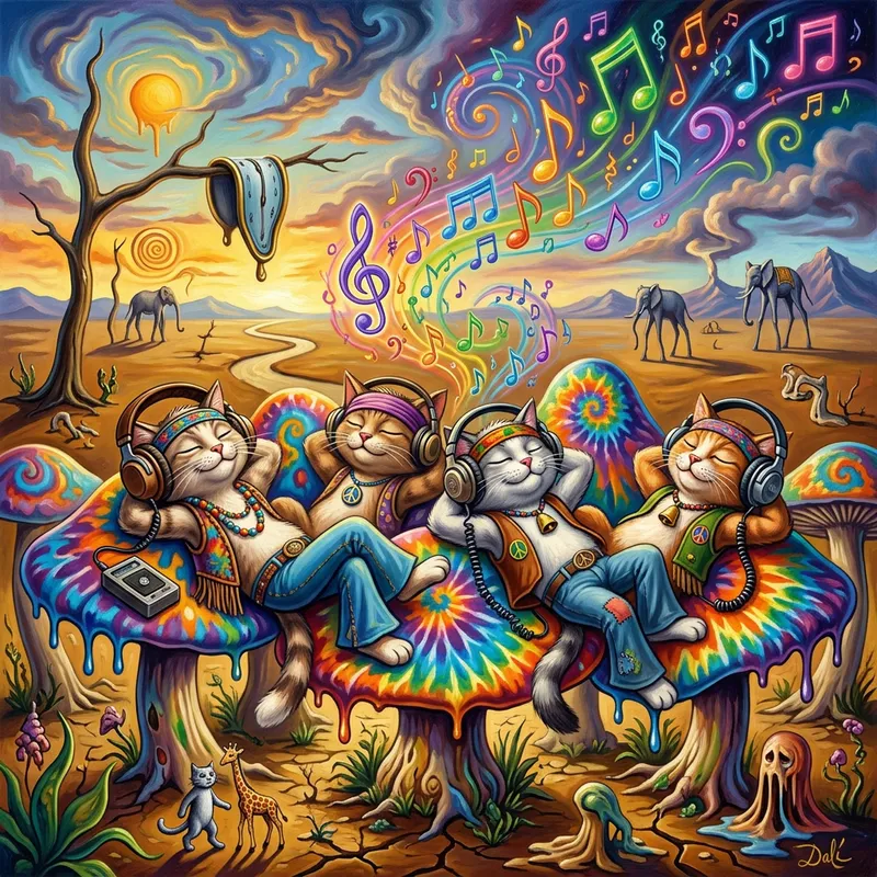 Surreal dreamlike Salvadore Dali style, a bunch of cartoon cats dressed like hippies laying on their backs on top of tie dye colored mushrooms listening to retro style headphones with their eyes closed and music notes.