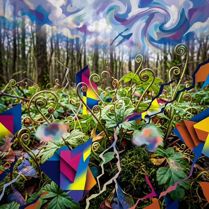 Explore the fusion of nature and abstraction in this image. Visualize a mishmash of vibrant foliage emerging from the verdant forest floor; curling, spiraling tendrils of vivid green weave together into a tapestry of organic texture. Amidst this natural growth, patterns of abstraction arise - geometric shapes, nebulous forms, and unpredictable, jagged lines begin to overlap the serenely beautiful landscape. The sky above reflects a similar theme with clouds morphing into imaginative forms reminiscent of abstract artwork. The powerful blend of organic beauty and the unpredictability of abstraction create a surreal display.