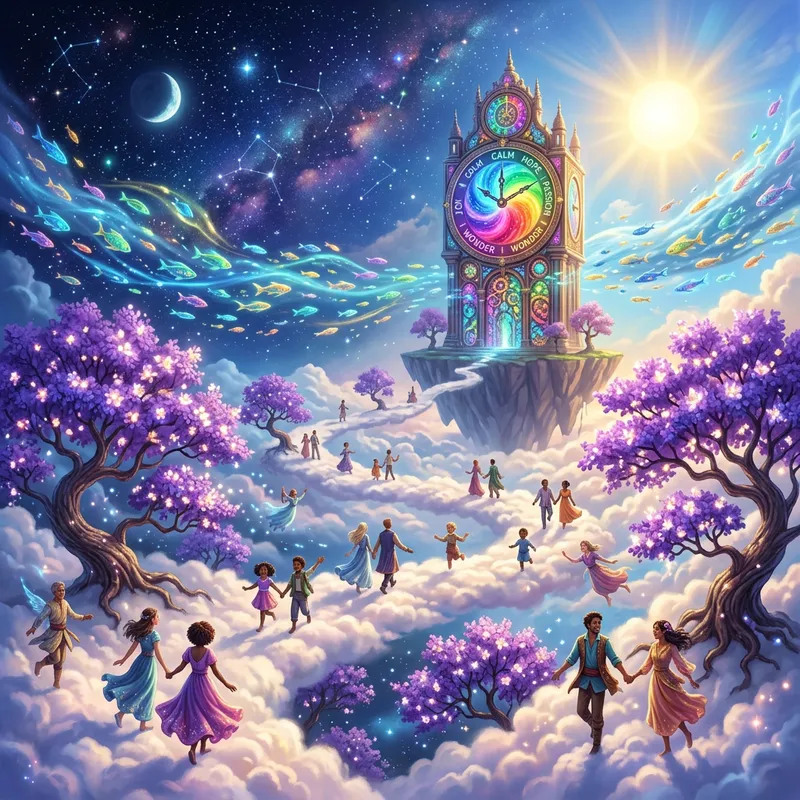 An absurd and unimaginable concept: A surreal landscape where gravity is optional, and people can walk on the clouds. The trees are of vibrant purple, blossoming with flowers of pure light. There's an ocean in the sky brimming with floating luminescent fish. The night and the day exist simultaneously, one half of the sky an eternal, star-studded darkness, and the other always basking in radiant sun. In the distance, an enormous clock tells not the time, but emotions displayed through a spectrum of colors.