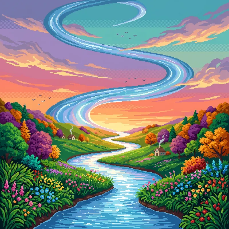 surreal landscape where a meandering river intertwines with the sky, adorned with lush green plant life that bursts with vibrant flowers. The river should be flanked by hills adorned with colorful foliage, and the sky should be bright and clear, with a dramatic sunset or sunrise, showcasing a blend of warm and cool tones. This landscape should capture the essence of natural beauty and tranquility, inviting the viewer to experience the tranquility of the river and the beauty of its surroundings. pixel art.