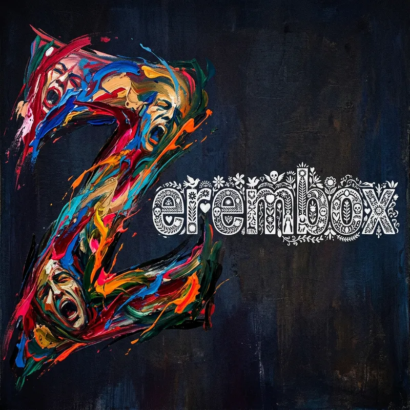 Create a two-part surreal logo portrait. The first part is the letter 'Z'. It is painted with bright colors and bold brushstrokes. It captures intense emotions and inner turmoil and is illustrated with the use of a wide-angle lens, creating a distorted perspective. The second part is the rest of the word, 'erembox'. It is depicted in a style characterized by intimate, symbolic, and complex details, akin to those prevalent in early 20th century Mexican folk art, but not directly referencing any specific artist. This part is in white color.