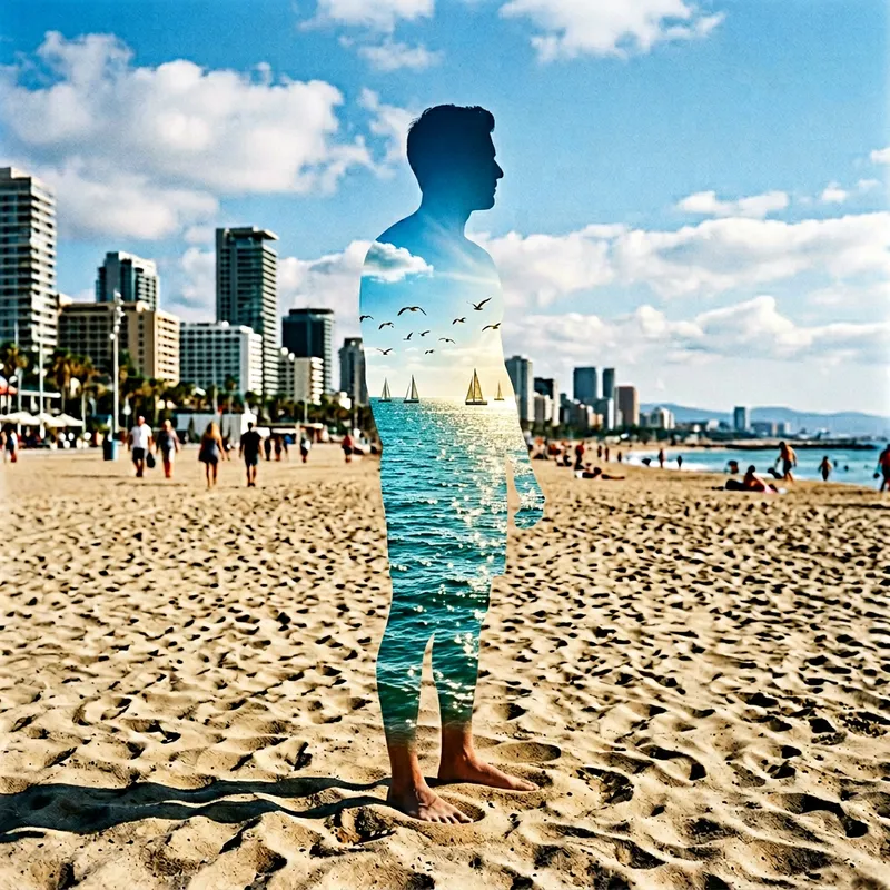 A surreal scene where the silhouette of a man is filled with a vast seascape. Inside his form, we see a vibrant sea under a clear blue sky. The sea is riddled with tiny white-capped waves, glittering with the golden rays of the sun. The silhouette is standing on a beach, with his feet sinking slightly into the fine, warm sand. A few distant sailboats dot the horizon inside the man's form, sailing serene under a flock of seagulls. The surrounding environment maintains a normal cityscape to bring contrast to the man's unique existence.