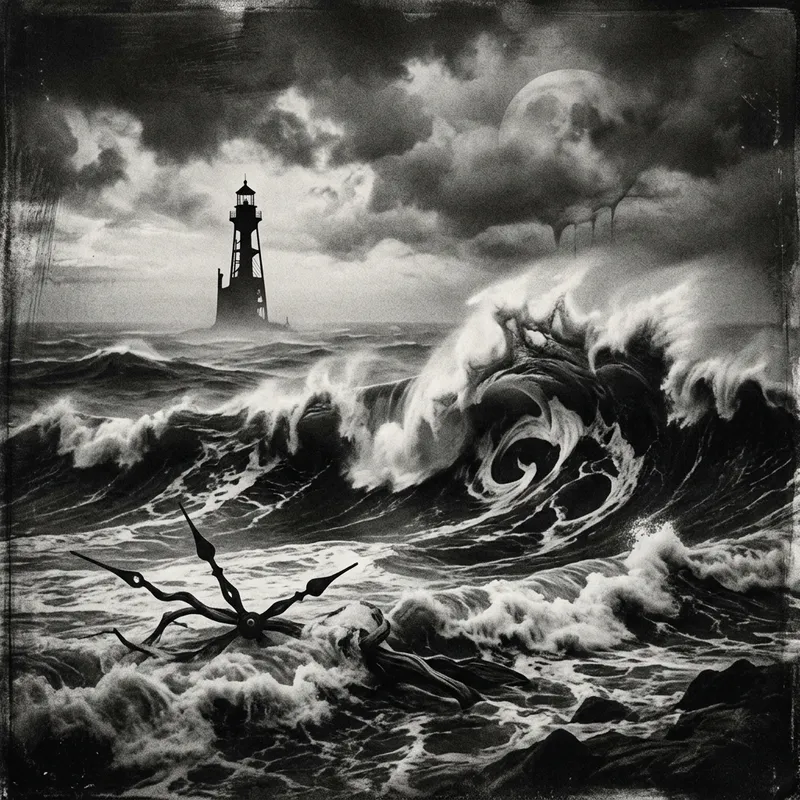 A haunting black-and-white photograph with high contrast lighting, capturing the powerful and surreal nature of the ocean. The image projects dreamlike and symbolic elements, reminiscent of works from the surrealism era, with dramatic, crashing waves that imbue a feeling of absurdity and defamiliarization. Should resemble traditional hand-drawn art.