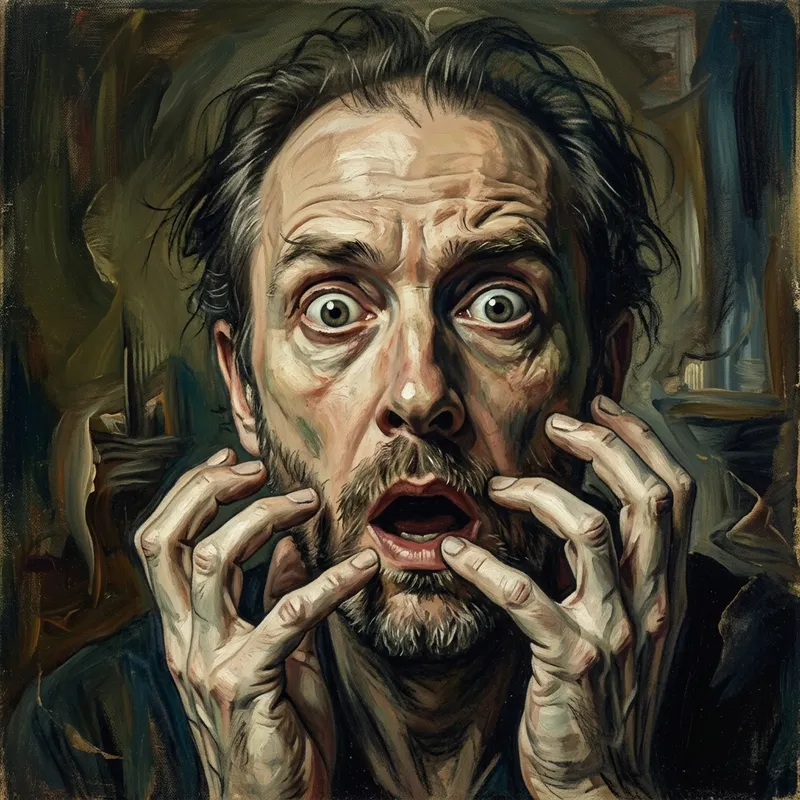 Create a surreal portrait of a Caucasian man with an exaggerated expression of surprise, utilizing the dreamy reality distortion, dramatic lighting, and eccentric emphasis on hands akin to the artistic era of late 19th to early 20th century surrealism. Use a close-up perspective and a blend of fine art techniques resembling mixed media painting to intensify the psychological thriller ambiance. Please refrain from portraying any recognizable artistic style from the post-1912 era.