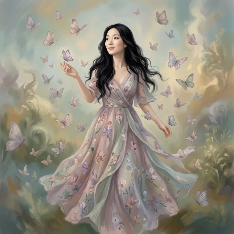 Create a surreal portrait of a woman in a floral dress. She is surrounded by floating butterflies, painted in soft pastel colors, capturing her graceful movement and dreamlike atmosphere. The painting should hint at a blend of ethereal, unusual, and dreamlike qualities, characteristic of the Surrealism movement, primarily observed in works created prior to 1912. The artistic medium is a digital painting with delicate brushstrokes, reflecting an essence of magical realism. The woman is of Asian descent with long wavy black hair gently touching her shoulders.