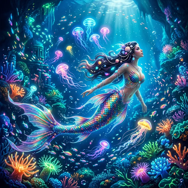 Discover a Magical Underwater Realm with Stunning Mermaid and Bioluminescent Creatures