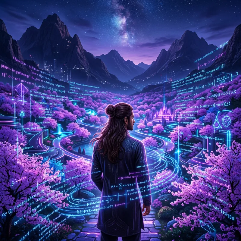 Picture a futuristic valley nestled between grand mountains, filled with cherry blossom trees in a full spectrum of colors, illuminated by the mysterious glow of neon purple and electric blue shades. The scene centers around a young South Asian man with long, dark brown hair elegantly styled in a bun, his face hidden from the viewer. As he contemplates in the heart of the valley, the air around him shimmers, displaying cascading lines of code forming complex patterns and symbols. These fantastic astoundments of his coding concepts merge harmoniously with the vibrant natural surroundings, blurring the boundaries between technology and nature. The image, shot with a high-resolution digital camera, conveys each minute detail of the cherry blossoms and the man's serenity. An azure sense of wonder and tranquility pervades the scene, decoratively blending the enchanting universe of technology, coding, and natural splendor into a unique surrealist marvel.