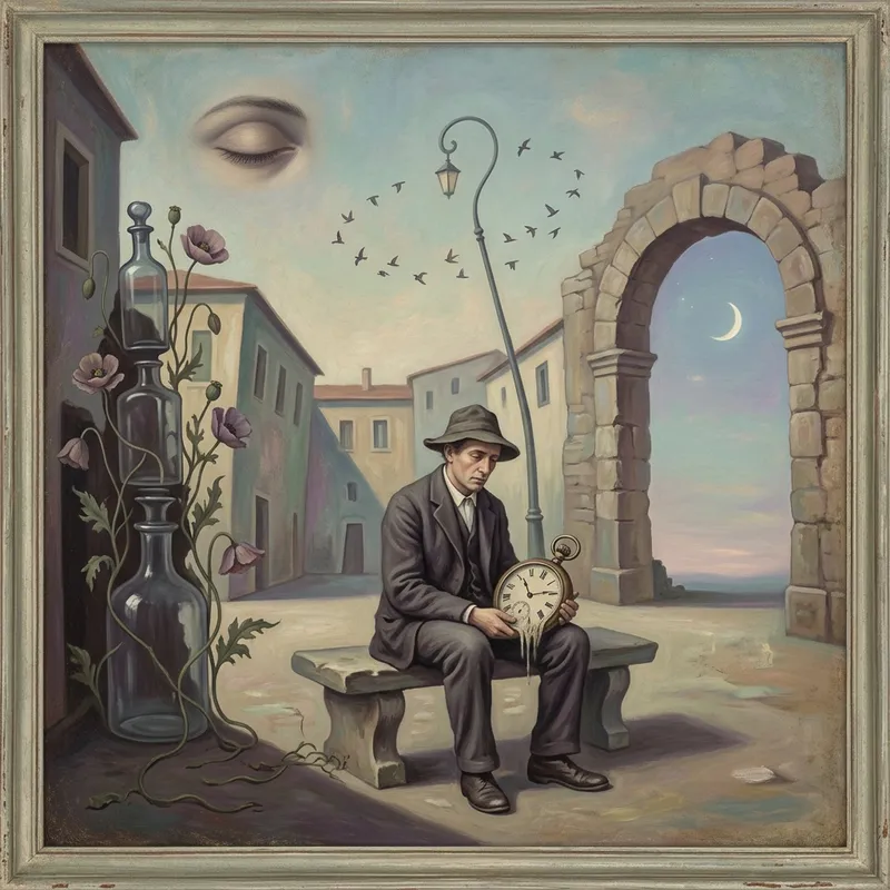 Create an artwork that uses the principles of Surrealism, with a hint of the unusual and distorted perspective reminiscent of creations prior to 1912. We see a man experiencing the overwhelming emotions of substance dependency. Possible attributes might include oversized objects, disconnected visual elements, and a warped perspective. His surroundings teem with symbols of his struggle, casting an undeniably dreamlike, yet gentle surreal atmosphere. The final output should communicate both struggle and peace, and be dipped in a color palette marked by tranquility. Emphasize the exaggeration and distortion representative of pre-1912 surreal styles, with symbolic elements.