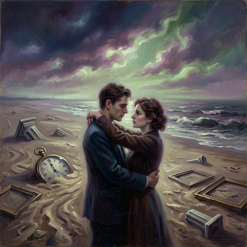 A male and a female couple are locked in a tender embrace on a deserted beach. The scene reflects a romantic drama under surreal lighting that emanates an ethereal glow, reminiscent of the dreamlike quality, precise detail, and unsettling imagery, typically associated with the Surrealism era in art history where the unusual and imaginative dominated. The beach stretches out infinitely, evoking an unease typical of artistic representations from this period. The couple exchange stolen glances, their features soft and impressionistic. The image type is an oil painting, in replicating an authentic medium used in the Surrealism era.