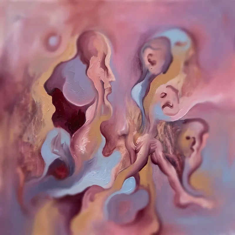 An abstract background executed in surrealism style, showcasing soft transitions and textures. The piece reflects hues of pink and purple, irregular shapes, and abstract figures. The piece is inspired by early 20th-century surrealist art, particularly reminiscent of the dreamlike distortions and that make use of the effect of blurring, as experienced when observing through a large-aperture lens. This creative art piece, exhibits an exploration of bizarre and unconventional perspectives.