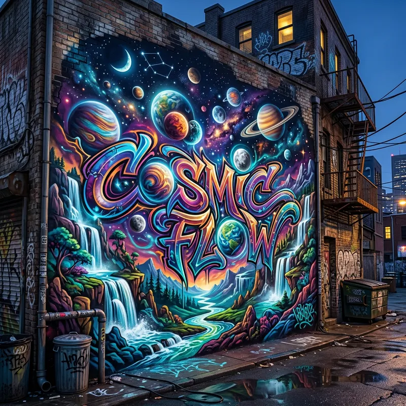 Imagine a surrealistic graffiti tag, with vivid colors and intricate detail, placed in an urban environment. The design of the tag features elements like planets, with various sizes and colors, spinning amidst a fantasy-inspired cosmos. The tag also integrates cascading multilayered landscapes, inspired by the fluidic beauty of waterfalls, into its design. The juxtaposition of planets and waterfalls creates an immersive cosmic landscape that confuses the boundary between urban grunge art and cosmic scenery.