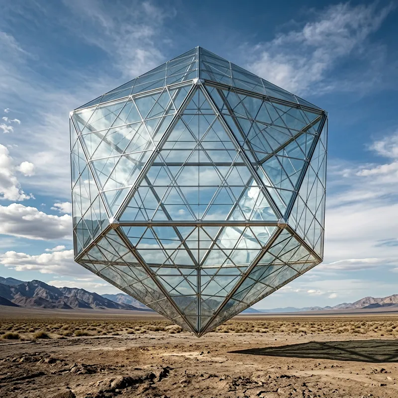 Imagine an immense clear glass icosahedron levitated 8 feet over the earth, its transparent surface absorbing and reflecting the encompassing panorama. The style of the image should recall the conventions of architectural photography, using a wide-angle lens to emphasize the grandeur and expansive size of the structure. The composition of the image should be minimalistic, devoid of non-essential elements, focusing only on the futuristic and extraordinary nature of this suspended geometric edifice.