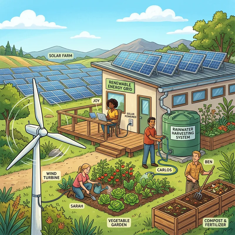 Illustrate a scene showing a sustainable process. The picture could show a solar farm under a clear sky, harnessing power from the sun. Nearby, an African woman is seen working on her laptop, powered by the renewable energy. In the foreground, a windmill spins gently adding more power to the grid. The concept of water conservation can also be accented by a rainwater harvest system, operated by a Hispanic man, which feeds a lush green vegetable garden maintained by a Caucasian woman. Rethinking waste is also a part of sustainability, with a Australian man composting organic waste into fertilizer.