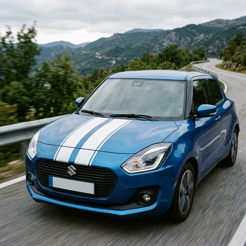 A Suzuki Swift car in a sleek metallic color, viewed from a front angle. The car's bonnet is adorned with two wide, parallel lines that run from the car's base to the windshield, giving it an intense and sporty appeal. The car radiates speed and dynamism, and the lines on the hood accentuate its compact design and highlight its signature aesthetics.
