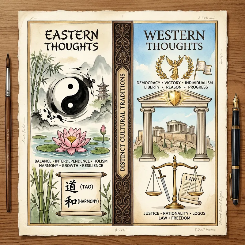 Create a symbolic representation to illustrate the difference between Eastern and Western thoughts on a size of a short bond paper. On the left side of the image, depict traditional Eastern symbols like Yin-Yang, lotus, or bamboo to represent Eastern philosophies such as balance, interdependence and growth. On the right side, portray Western symbols like the Greek pillars, laurel wreath, or the scales of justice to represent values of the Western world such as democracy, victory and law. Please maintain a clean border between the two sides, symbolizing the distinct cultures.